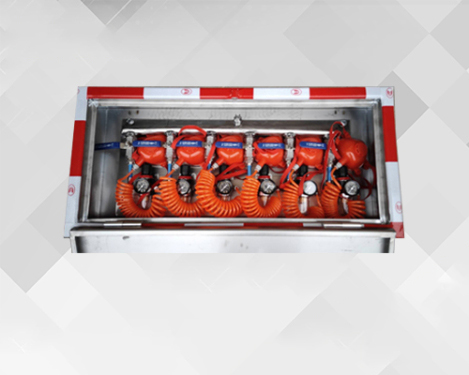 矿用压风自救装置包括箱体,箱体上设有压风接头,其内设有多组分别与压风管相连的呼吸器,每组呼吸器的支管上均设有手动进气阀。当作业场所发生有害气体突然涌出、冒顶和坍塌等危险情况时,现场人员来不及撤离,可就近利用压风自救装置实行自救。打开门盖,取出呼吸面罩带上,钮开进气阀,通过供气量调节装置对压风管路提供的压风根据需要进行调节,再通过气动减压阀,进行减压和消除噪声,然后由积水杯将不清洁的压风变成清洁的呼吸空气,供给现场人员呼吸,达到稳定情绪、实现现场自救目的。该装置结构紧凑,使用方便,具有广泛的实用性。