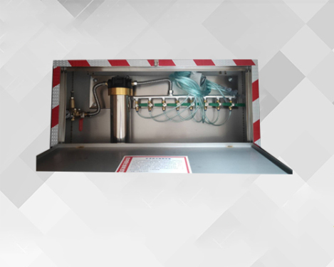 矿用压风自救装置包括箱体,箱体上设有压风接头,其内设有多组分别与压风管相连的呼吸器,每组呼吸器的支管上均设有手动进气阀。当作业场所发生有害气体突然涌出、冒顶和坍塌等危险情况时,现场人员来不及撤离,可就近利用压风自救装置实行自救。打开门盖,取出呼吸面罩带上,钮开进气阀,通过供气量调节装置对压风管路提供的压风根据需要进行调节,再通过气动减压阀,进行减压和消除噪声,然后由积水杯将不清洁的压风变成清洁的呼吸空气,供给现场人员呼吸,达到稳定情绪、实现现场自救目的。该装置结构紧凑,使用方便,具有广泛的实用性。